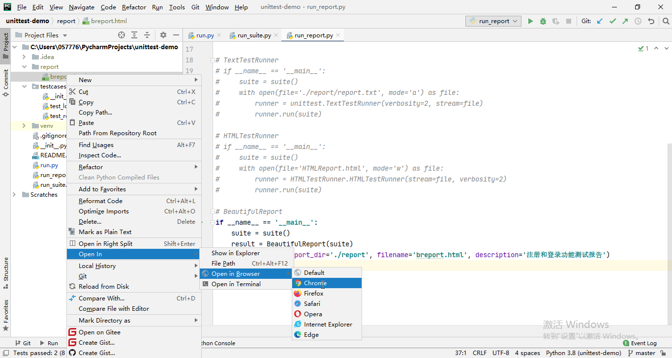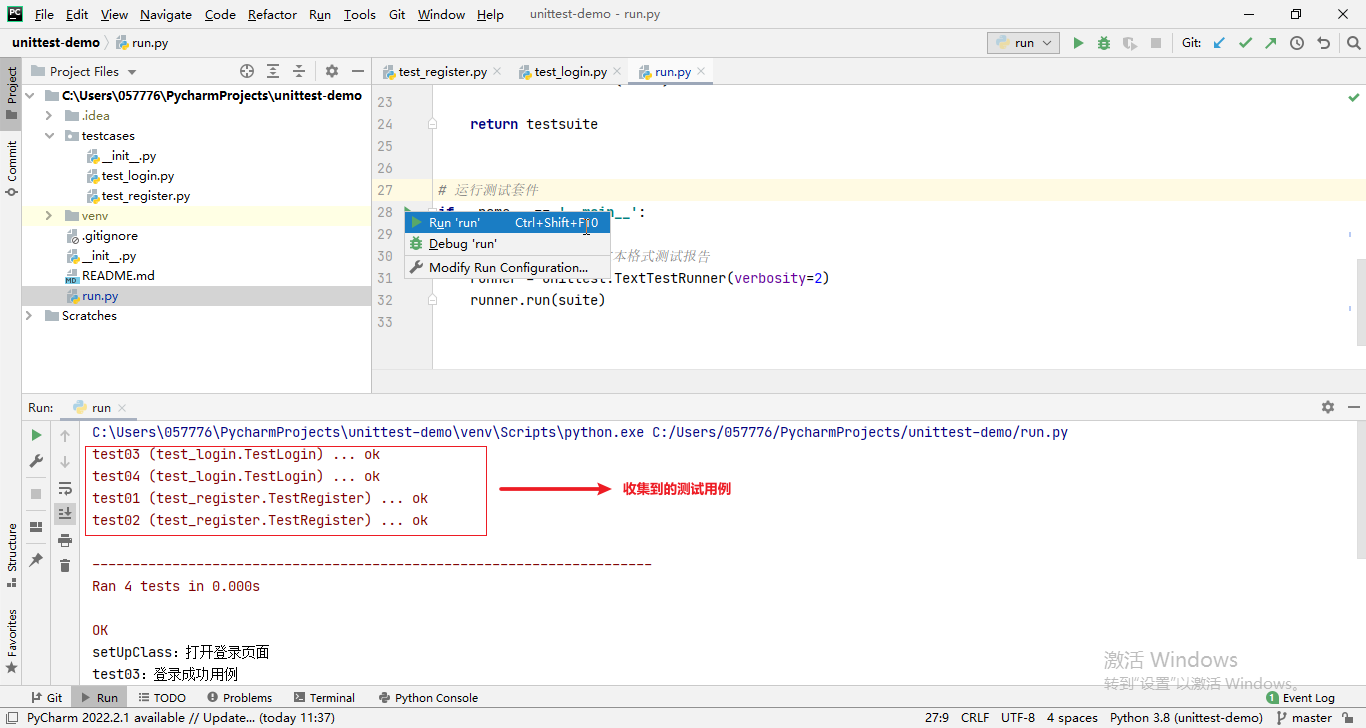 项目根目录中,新建程序主入口run.py文件,运行测试用例并生成测试报告。这一步可以拆分成如下步骤: