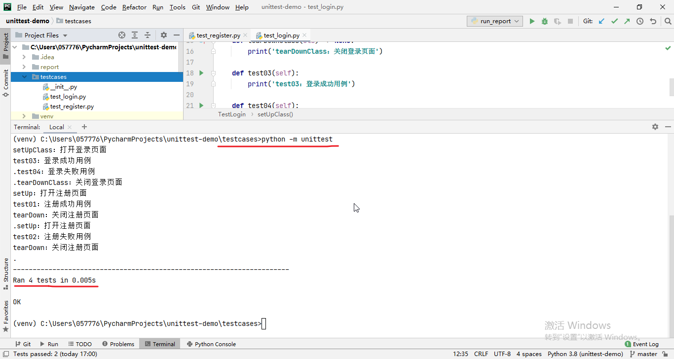 以上文的注册功能测试用例test_register.py,登录功测试用例test_login.py为例,打开Terminal终端,进入路径testcases中,输入命令:python -m unittest
