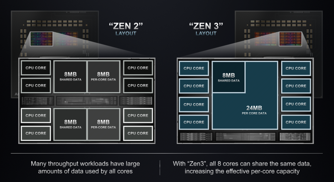 以数据库应用为例,原先的Zen 2只有少数核心可以共享缓存,而且会用去一半的三级缓存。全新的Zen 3则不同,它只会用四分之一的三级缓存,而且每一个核心都可以访问,能够有效提高命中率,而这个命中率就会直接反映到性能提升上——无论多核心或是多线程的应用,均是如此。