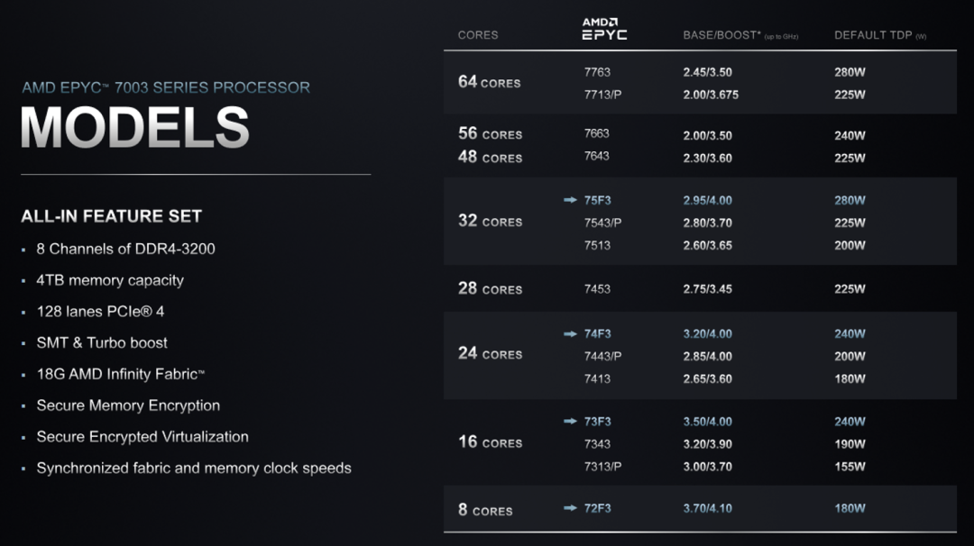 第二类的五款是核心密度高的产品,其中7643是48核,7663是56核,其他三款均为64核,主要是针对企业应用、高性能计算和云计算,能够给行业提供非常高的多线程运算性能和多插槽运算性能。