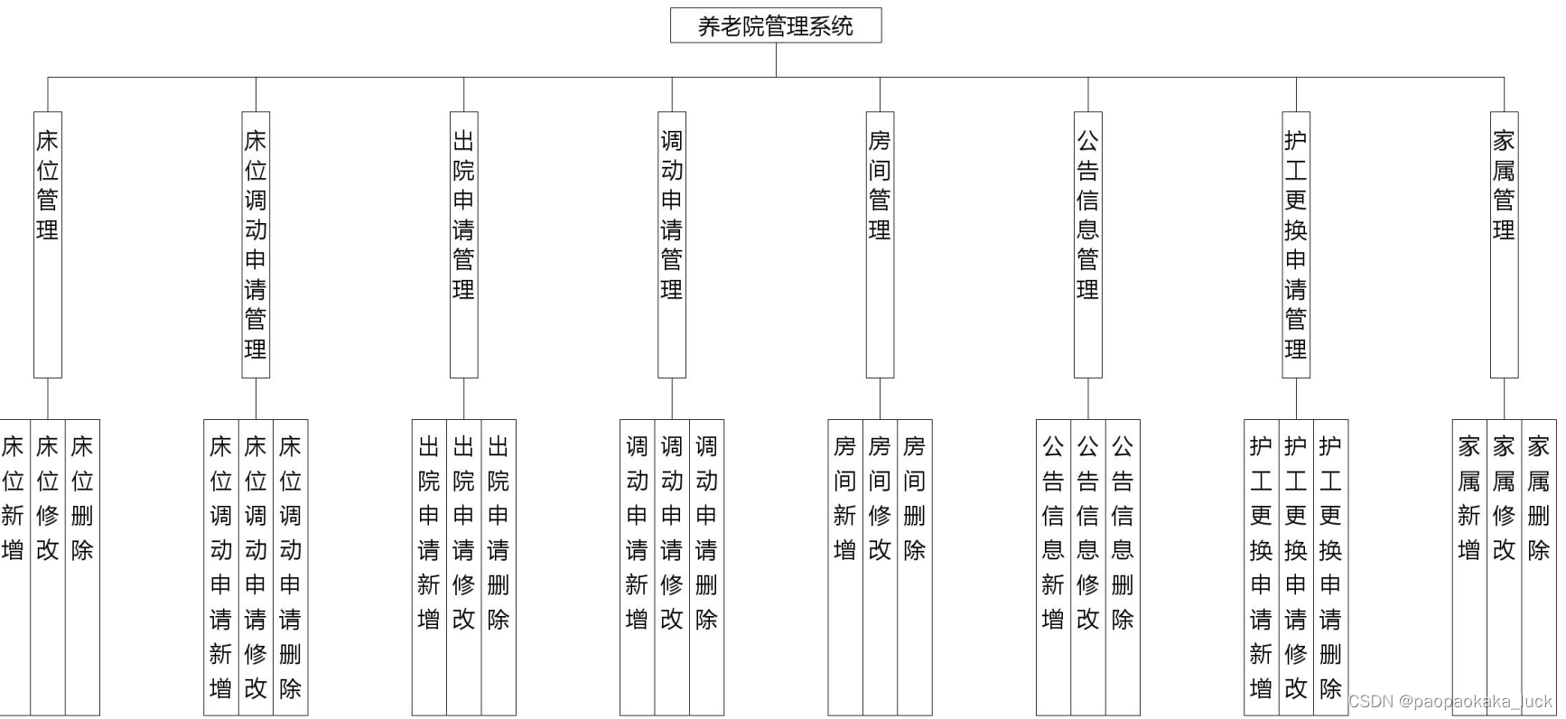 养老院管理系统、整体采用 Java 作为后台主要技术语言,利用 MySQL 数据库建立数据分析表来储存系统软件造成的信息。后台主要框架采用 SpringBoot 框架进行整体框架和布局。这个的话系统能够提供信息表明以及相应的服务项目,系统实现了包括床位管理、床位调动申请管理、出院申请管理、调动申请管理、字典管理、房间管理、公告信息管理、床位更换申请管理、家属管理、健康信息管理、老人管理、老人请假申请管理、离职申请管理、请假申请管理、床位管理、管理员管理。用户的功能等。总而言之,养老院管理系统集中化管理信息,具备安全性强、工作效率高、内存空间大、成本费用低等特点。能降低信息管理成本费,完成信息管理。