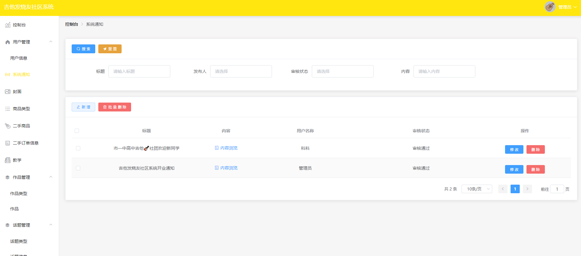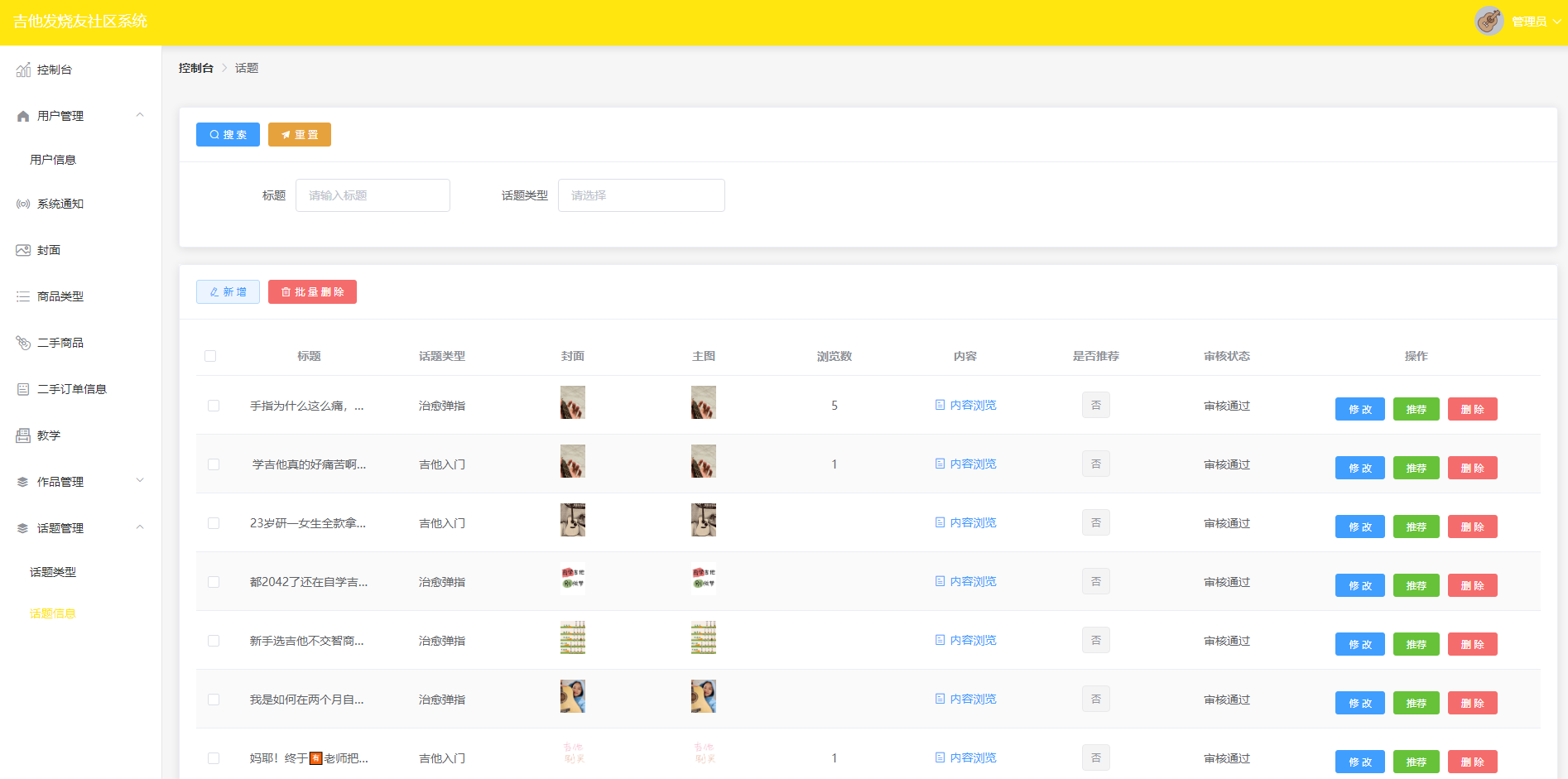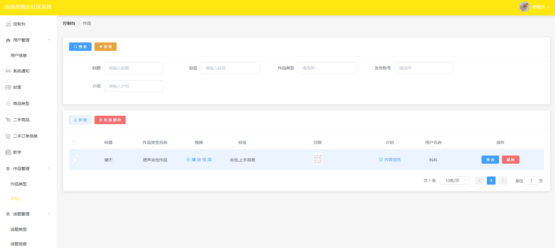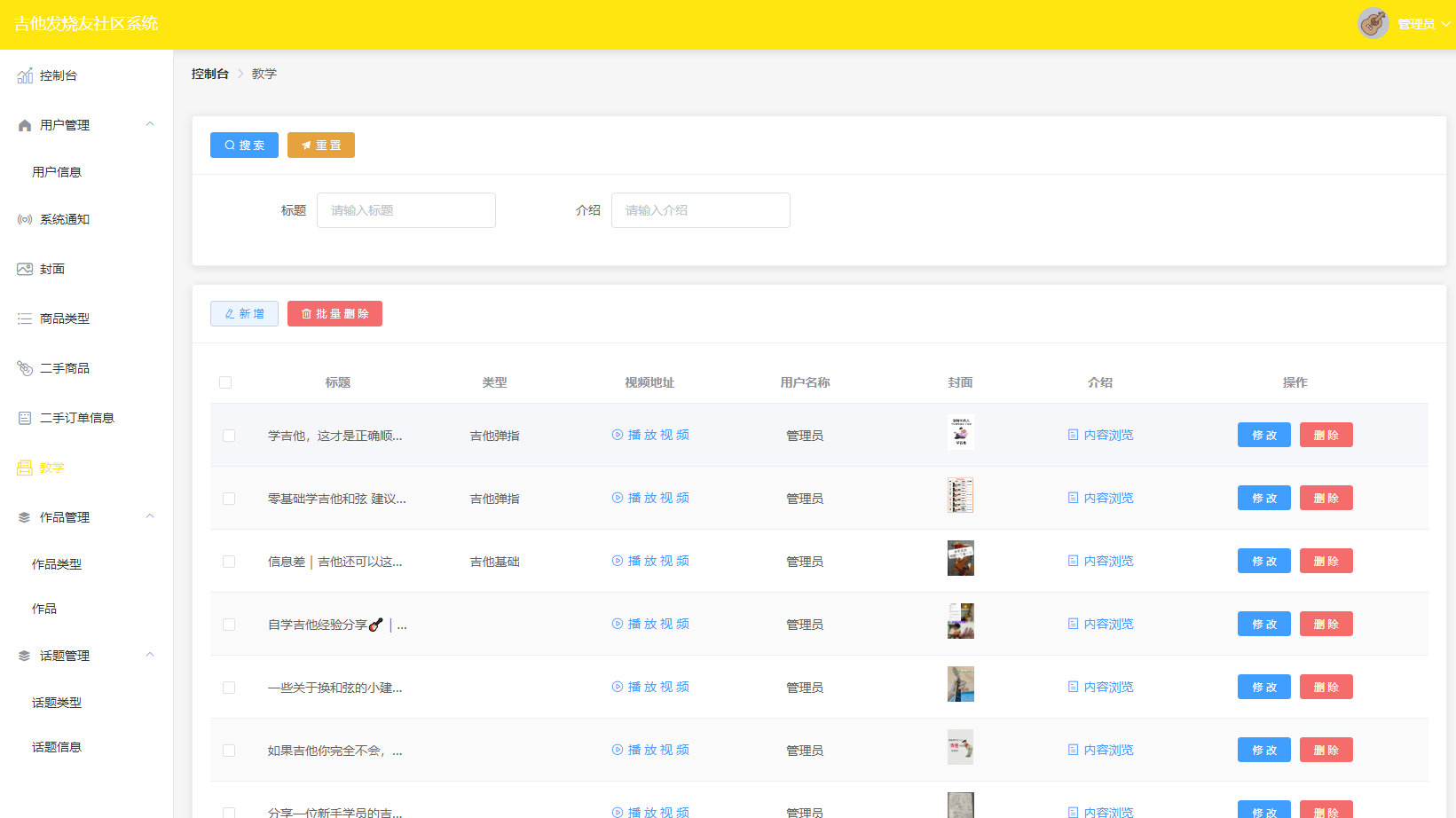管理员拥有对吉他教学进行管理的权限,可以为用户新增吉他教学知识。管理员可以对已有的吉他教学内容进行修改或删除。此外,管理员还支持批量删除功能,可以同时删除多个吉他教学内容。