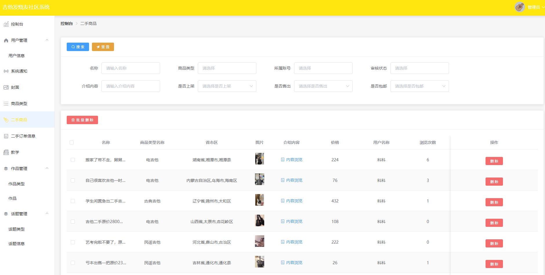 提供筛选条件,如名称、审核状态等,以便管理员可以更精确地查找二手吉他商品信息。当管理员点击搜索按钮或按下回车键时,将搜索参数传递给后端接口/Good/List。接收后端返回的二手吉他商品列表数据,并在页面上进行分页展示。为每个商品添加一个删除按钮,管理员可以选择批量删除或单个删除商品。提供一个审核功能,管理员可以对商品进行审核操作,只有审核通过的商品才能被展示。在商品列表中显示商品的基本信息,如名称、价格、介绍内容等。