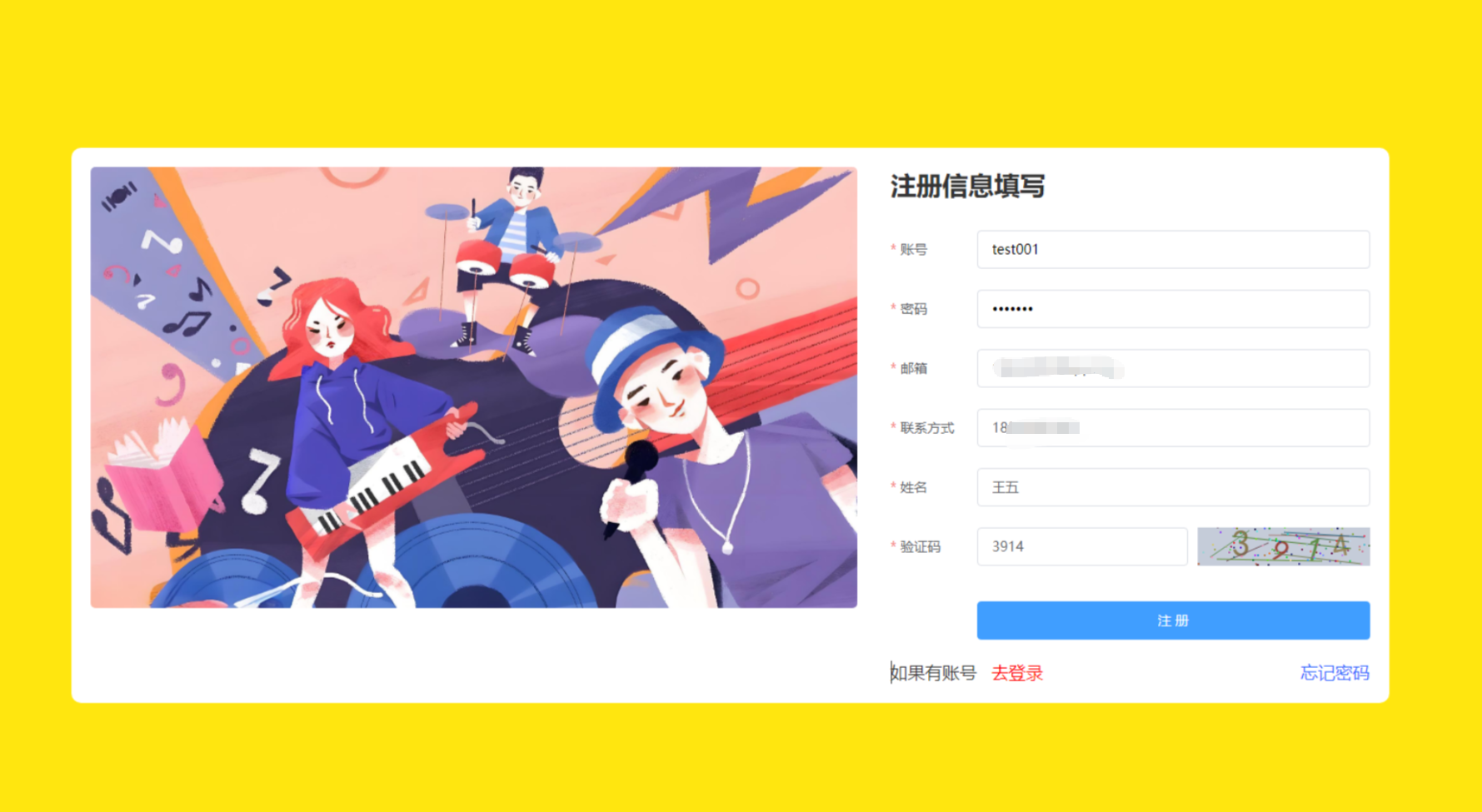 用户注册界面,用户需要正确的账号、密码、邮箱、联系方式、姓名和图形验证码信息,当通过前后端校验后,会弹框提示注册成功,并跳转到登录界面。