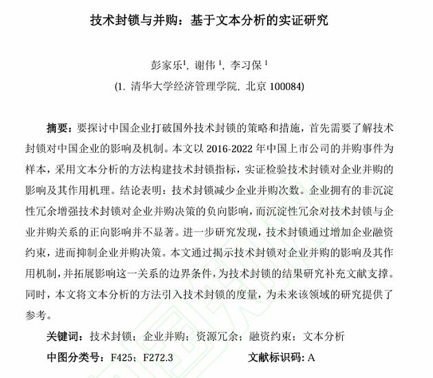 彭家乐,谢伟,李习保.技术封锁与并购:基于文本分析的实证研究[J/OL].科学学研究,1-22[2024-08-21].