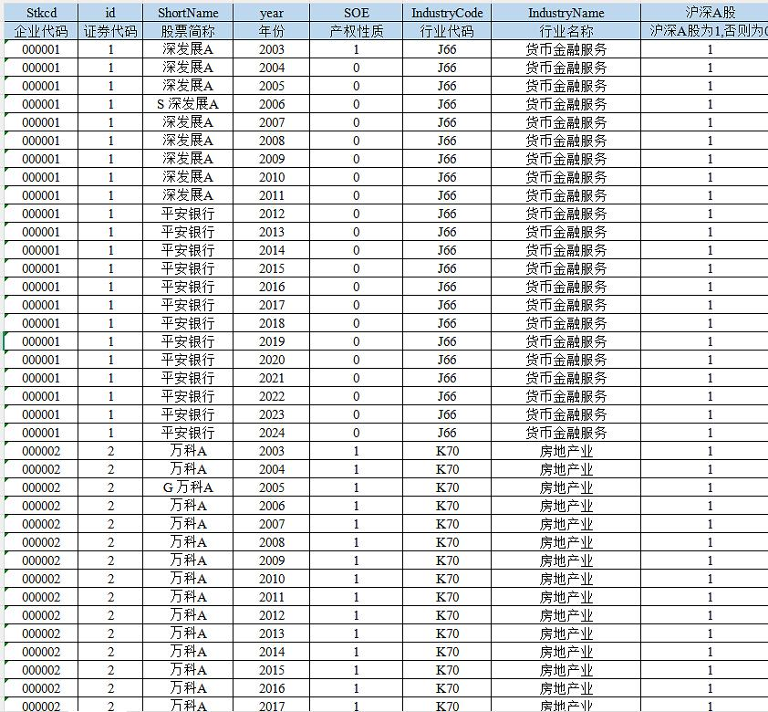 企业代码 证券代码 股票简称 年份 产权性质,是否为国企 行业代码 行业名称 沪深A股为1,否则为0 北京A股为1,否则为0 金融业为1,否则为0 制造业为1,否则为0 ST或PT为1,否则为0 上市板块