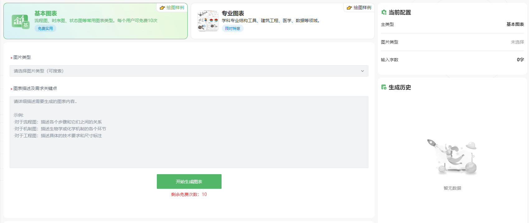 - 基本图表:包含流程图、时序图、状态图等通用类型,适用于“研究步骤”“实验流程”“算法逻辑”等场景,每位用户可免费使用10次;