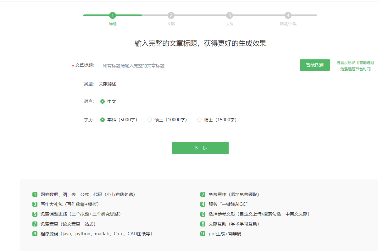 - 我的实践心得:标题越具体、越完整越好。一个模糊的标题会导致AI生成的内容泛泛而谈。建议在标题中包含“研究对象”、“研究变量”和“研究区域”,这样AI才能精准定位。
