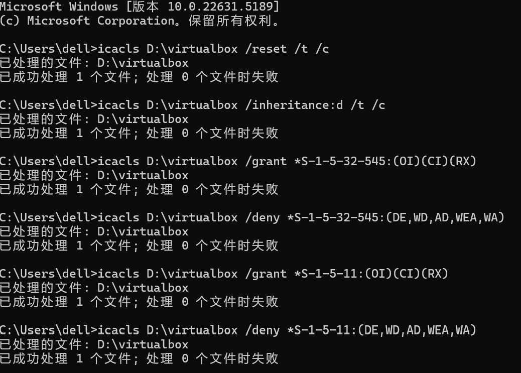 icacls D:\virtualbox /reset /t /c