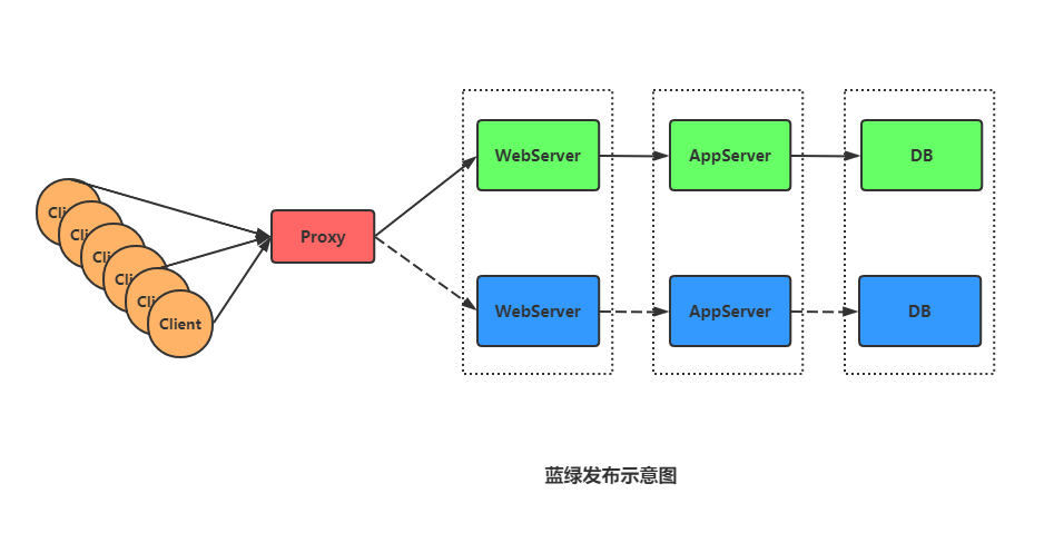 蓝绿部署中,一共有两套系统:一套是正在提供服务系统(也就是上面说的旧版),标记为“绿色”;另一套是准备发布的系统,标记为“蓝色”。两套系统都是功能完善的,并且正在运行的系统,只是系统版本和对外服务情况不同。正在对外提供服务的老系统是绿色系统,新部署的系统是蓝色系统。