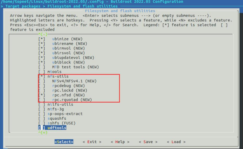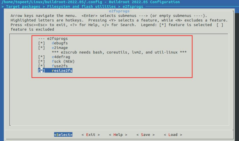 想要的文件系统支持 ext2 ext3 ext4 文件系统分区, 请参考下图配置增加e2fsprogs 工具包。依次选择如下配置项: -> Target packages-> Filesystem and flash utilities-> e2fsprogs
