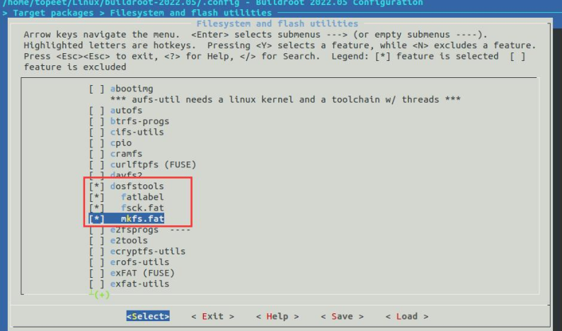 想要的文件系统支持 FAT32 格式的分区, 则需要参考下述操作进行配置dosfstools 工具包。依次选择如下配置项: