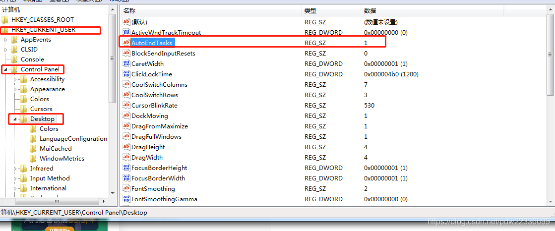 1、注册表自动结束进程,防止程序无响应AutoTasks值设置为1,没有这个字段就新建一个