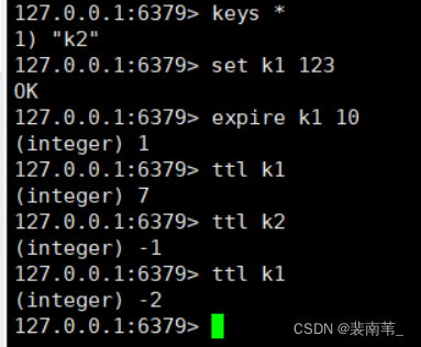 这里可以看到,我们给k1设置10秒,10秒内查看ttl可以看到k1的剩余时间,10秒后可以看到k1已经返回-2表示已经过期,而k2没有设置过期时间,返回-1表示永不过期