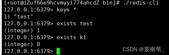 | exists key | 判断某个key是否存在 返回1为存在,返回0为不存在 |