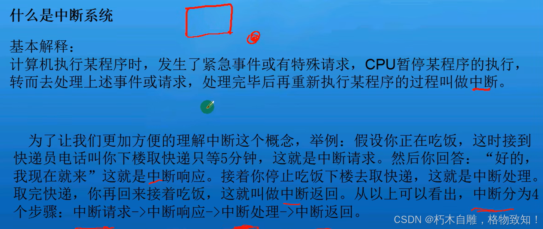 中断系统简介 解决速度矛盾: 处理速度慢的器件处理完了,给处理速度快的器件发一个中断请求,速度快的器件与速度慢的器件协同完成一件事情。实现并行工作:平时自己做着自己的工作,红外遥控器按下后,执行遥控的指令,由于速度很快,人看不出有卡顿。应付突发事件:车辆倒车雷达发现要撞墙了,对其它器件发起中断,让其他器件发出警告(语音报警灯)
