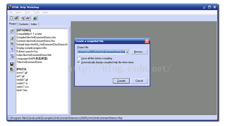 运行HTML Help Workshop,可以打开XmlCommentDemo.hhp文件.单开文件后,单击"File"->"Compile...",弹出如下图的界面: