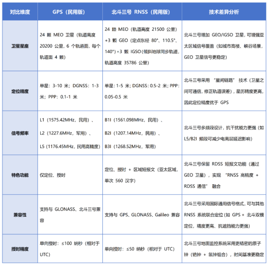 RNSS 系统的核心是 “全球覆盖 + 高精度”,GPS 是全球最早成熟的 RNSS 系统,而北斗三号 RNSS 则是兼顾 “高精度、兼容性、特色功能” 的新一代系统,二者对比如下: