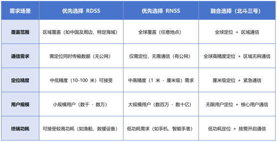 解决了 “高精度定位” 与 “无网通信” 的矛盾,如远海渔船可通过 RNSS 实现 1 米级定位(精准捕鱼),同时通过 RDSS 发送渔获信息(无网场景);救援人员可通过 RNSS 实现厘米级定位(精准找到被困者),同时通过 RDSS 发送救援进展(灾区无公网);