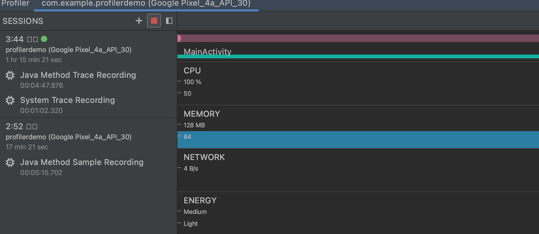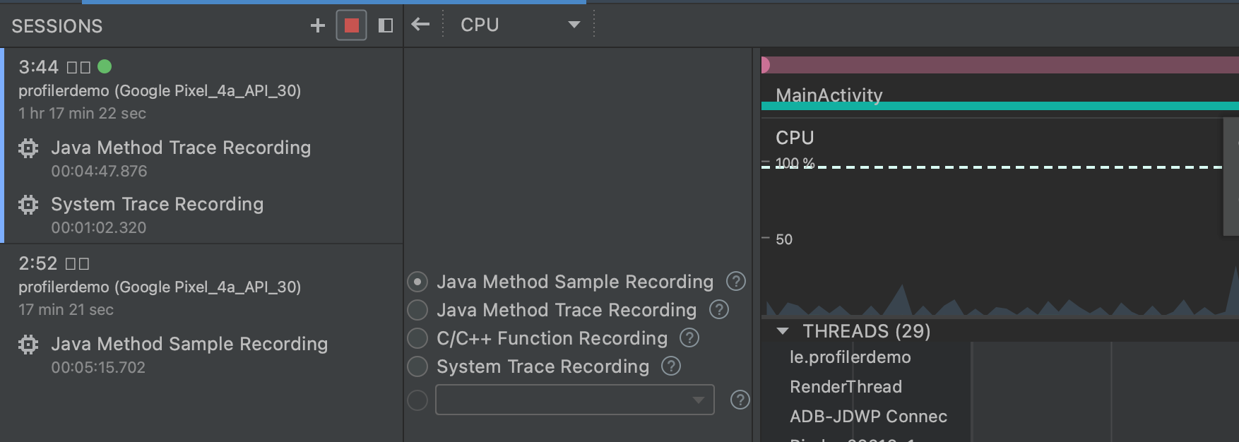依次选择 View > Tool Windows > Profiler 或点击工具栏中的 Profile图标 点击 CPU 时间轴上的任意位置以打开 CPU 性能剖析器 2.2 CPU 性能剖析器说明 CPU剖析图 剖析图说明 事件时间轴:显示应用中的 Activity 在其生命周期内不断转换经历各种不同状态的过程,并指示用户与设备的交互,包括屏幕旋转事件 CPU 时间轴:显示应用的实时 CPU 使用率(以占总可用 CPU 时间的百分比表示)以及应用当前使用的线程总数 线程活动时间轴:列出属于应用进程的每个线程,并使用下面列出的颜色在时间轴上指示它们的活动 <