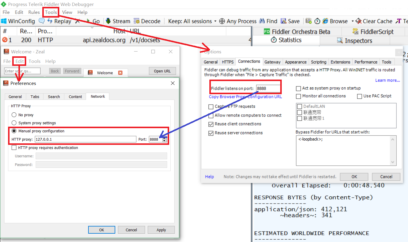 在Zeal的Edit > Preferences中设置网络代理为127.0.0.1,端口8888.