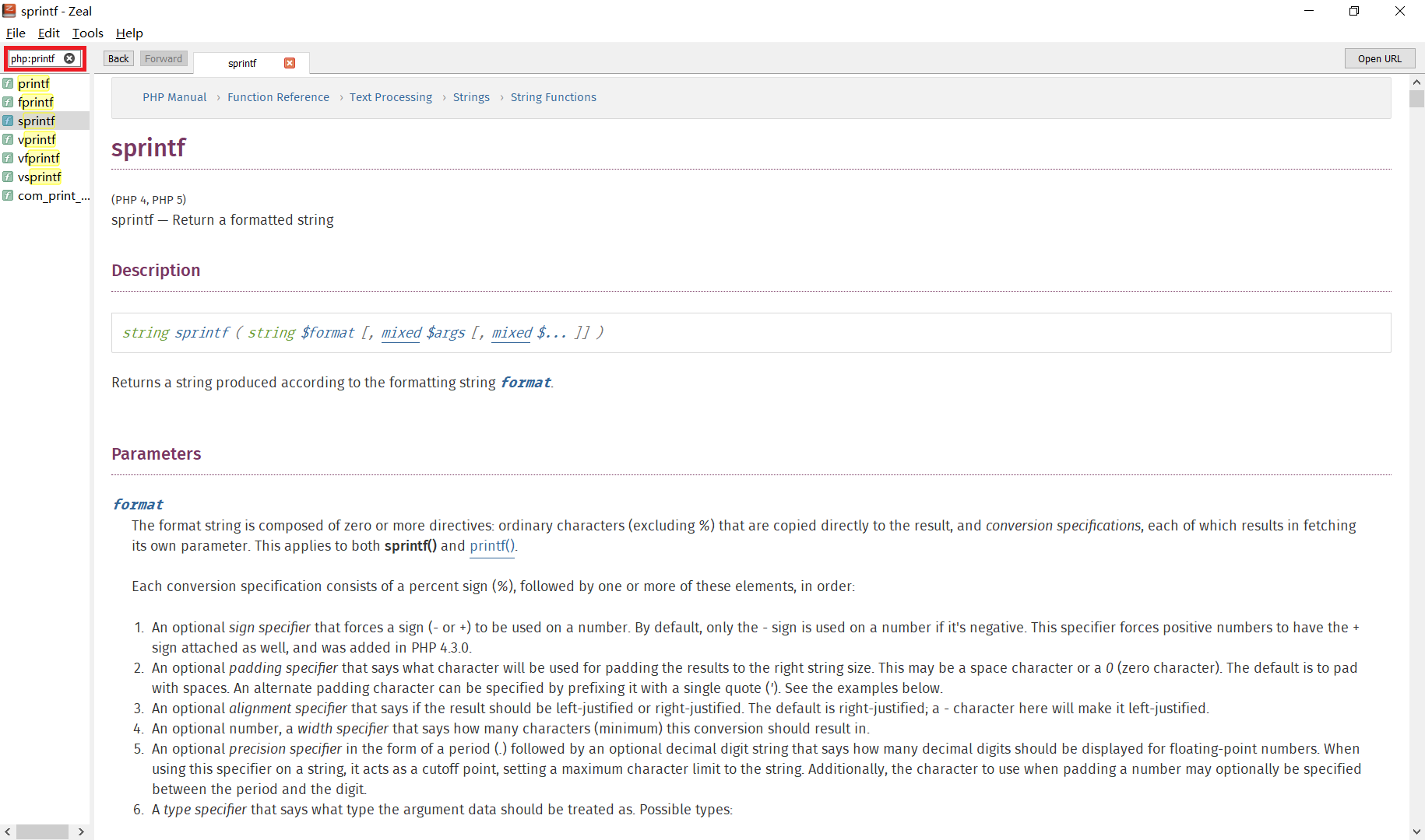 下载完成后,将tgz解压到Zeal的安装路径的docsets文件夹下面,再启动Zeal就能使用搜索功能了。