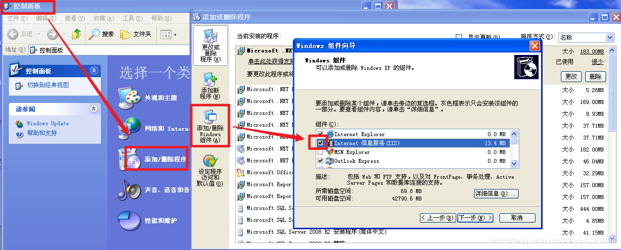 可通过“控制面板——添加/删除程序——Windows组件”,添加IIS组件来安装。安装过程中需要用到Windows XP安装盘。
