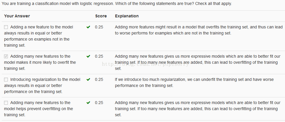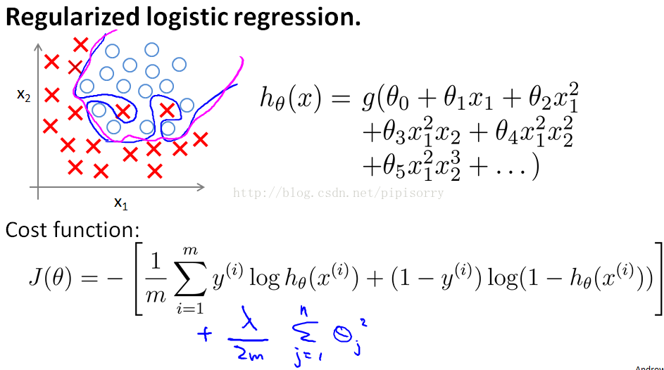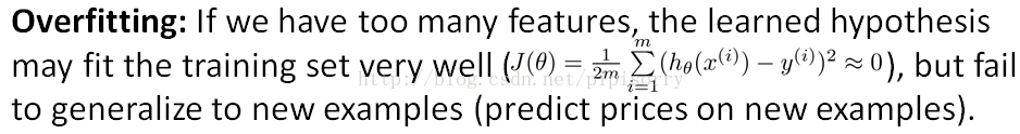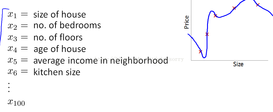 如在逻辑规划中,如果你有太多的features(不一定是多项式features),就可能导致过拟合。More generally if you have logistic regression with a lot of features.Not necessarily polynomial ones, but just with a lot of features you can end up with overfitting.