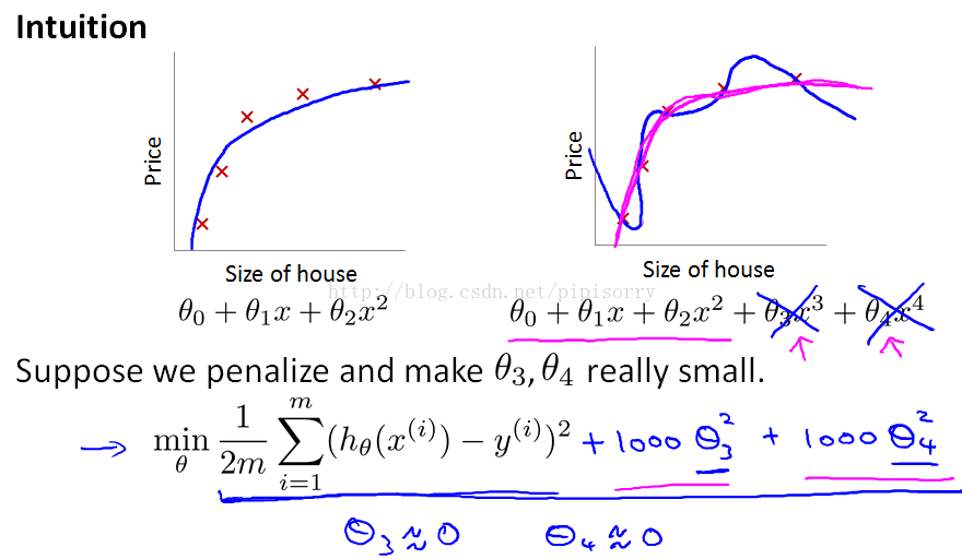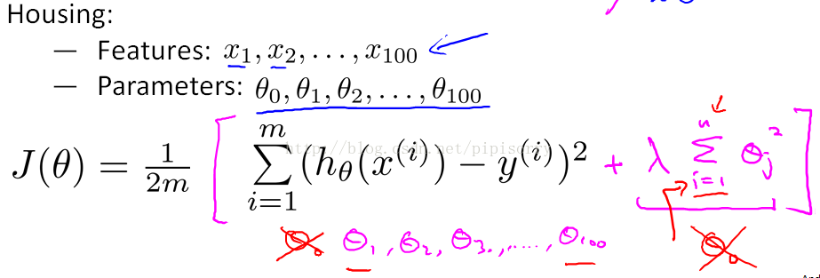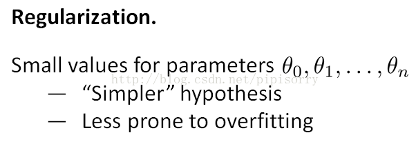 用于控制很好地拟合训练集和保持参数足够小的权衡,这样的话可以使hypothesis更简单从而避免过拟合。controls the trade of between the goal of fitting the training set well and the goal of keeping the parameter plan small and therefore keeping the hypothesis relatively simple to avoid overfitting.