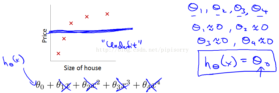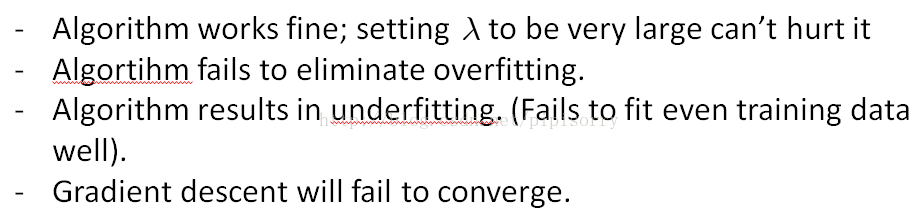 λ太大,惩罚参数太狠,所有参数都接近0,这样就可能拟合出一条水平线,导致欠拟合underfitting。