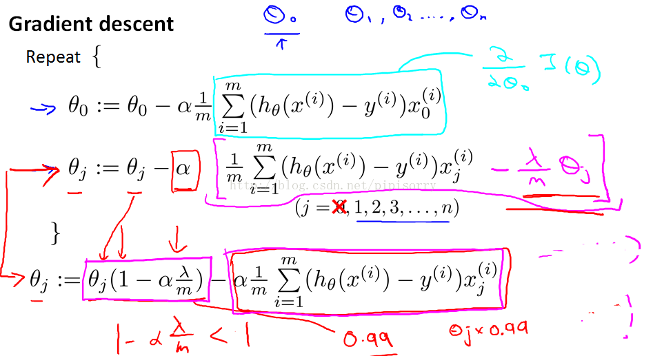 regularized的解释:在每一步规格化时,θJ总是乘上一个小于1的数,这样就可以shrinking参数θJ一点点,这也就是的效果。