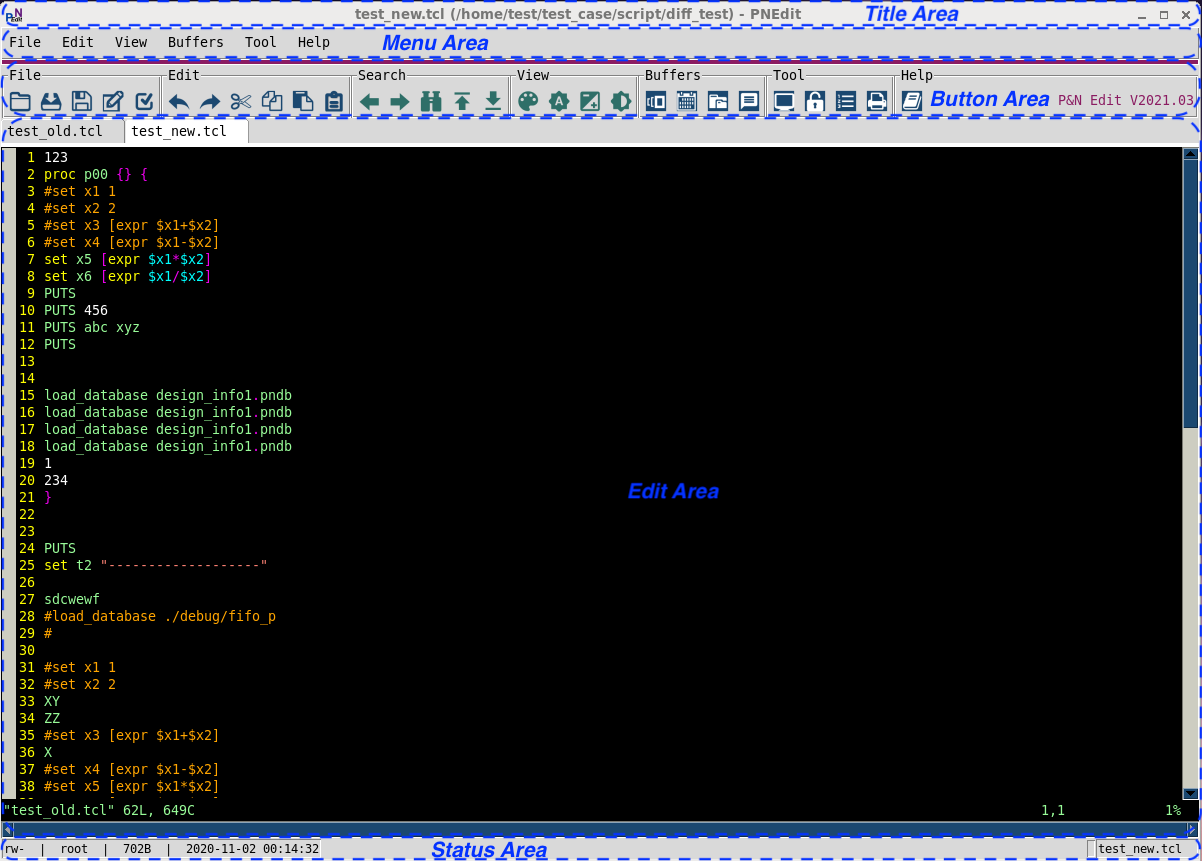 1、界面概述PNEdit界面如下图1所示主要分成Title、Menu、Button、Edit和Status这5个区域。Title区域用来显示当前编辑的文件全路径。Menu区域有File、Edit、View、Buffers、Tool和Help这6个菜单项,Button区域有File、Edit、Search、View、Buffers、Tool和Help这7个按钮项,Edit区域为文本编辑窗口按Tab和Split的方式多窗口编辑文件内容,Status区域显示当前编辑的文件属性信息。...