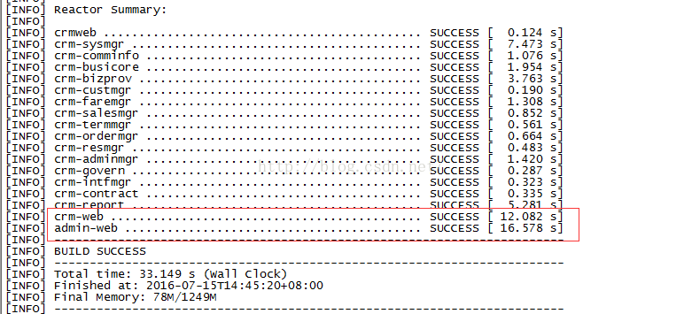 最近在部署项目时发现,Maven编译打包相当耗时,比之前项目用Gradle慢了很多倍,特别是对于WEB工程,打war包花的时间很长,在unix主机下一般会用到3到4分钟,如果有多个WEB工程,那简直不能忍受,经过查找资料并结合本人真实验证,原本编译打包需要8分钟的项目,优化编译后时间减少至34秒。如下图: