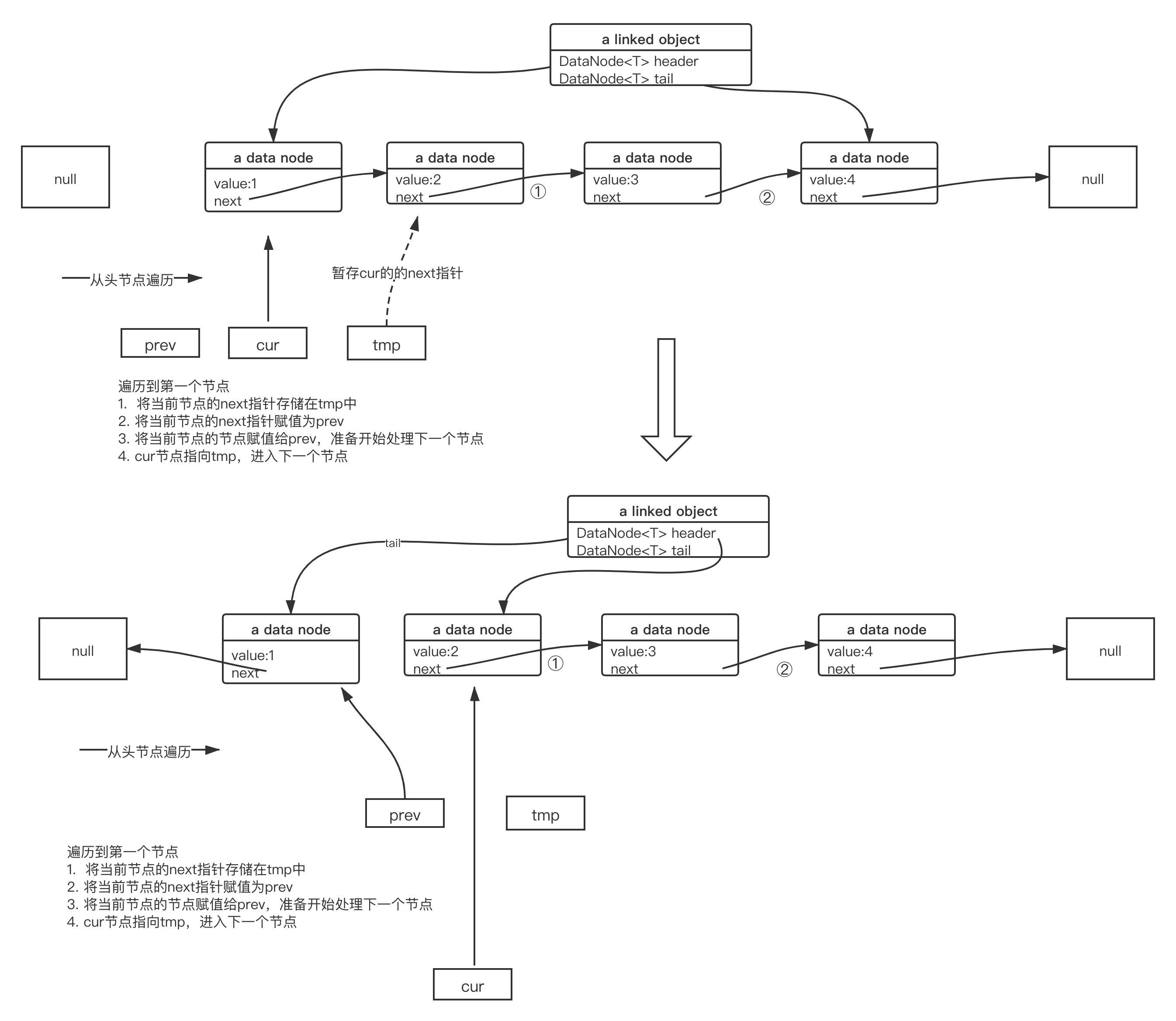 另外一个核心点就是,在遍历过程中,对当前节点的next指针进行操作(赋值为前驱节点)时必须暂存该节点的next指针,否则next指针丢失,无法遍历到链表的结尾。