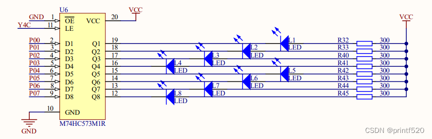 蓝桥杯单片机比赛LED灯模块 例如:P25==1、P26==1、P27==0表示的二进制数是011 转化为 十进制数就是3,控制的也就是Y3口,以此类推,就可以实现控制八个IO口。M74HC573M1R锁存器:锁存器也是为了节省IO口资源,观察原理图我们不难发现八个LED灯是连接在573锁存器上的,锁存器的另一端是连接在单片机的八个P0口上的,既然这样为什么不直接将LED灯连接在单片机IO口上呢?首先我们在写程序之前要看懂原理图,要操作的模块是受哪部分的IO口控制的,然后在根据原理图控制的IO口来写程序。