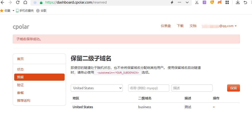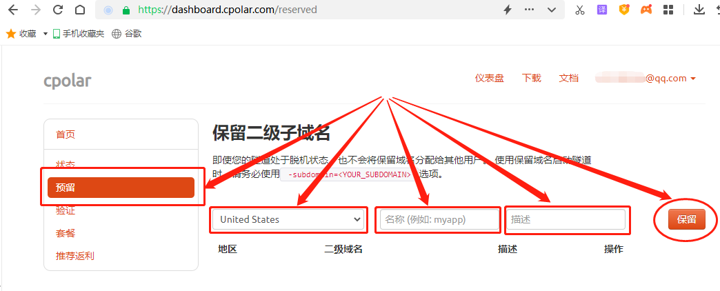 在保留二级子域名栏位,我们需要对“地区”、“名称”、“描述”三个信息进行补全,其中“地区”选择我们实际使用的地区即可;“名称”则是二级子域名中我们想要体现的要素(如博客名或其他信息);“描述”则是我们区分其他数据隧道的信息(并不会体现在二级子域名中)。在这些信息填写完毕后,就能点击右侧的“保留”按钮,将这条数据隧道储存下来。