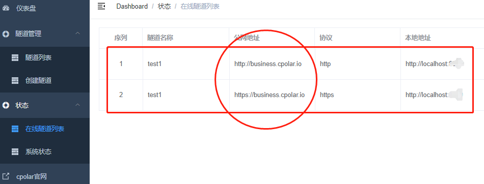 数据隧道创建成功后,我们可以点击cpolar主界面左侧“状态”项下的“在线隧道列表”查看到Ubuntu网页的公网地址,这就是数据隧道的入口,互联网访客可以访问这个地址,浏览到我们在Ubuntu系统上搭建的网页。