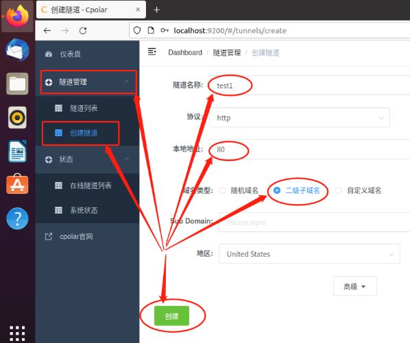 而数据隧道出口的设定也非常简单,我们主要对“隧道名称”、“本地地址”、“域名类型”和“地区”几个栏位进行设定。隧道名称主要用来区分本地各条隧道的用途,类似于备注;本地地址则是Ubuntu本地网页的输出端口;域名类型直接选择二级子域名,并将从cpolar云端获得的二级子域名名称填入下一行栏位中;最后的地区则按照实际使用位置选择。在各项栏位都填写完毕后,就可以点击下方的“创建”按钮,生成稳定的二级子域名数据隧道。