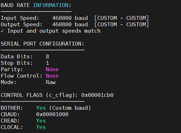 printf("BOTHER: %s\n", (tty.c_cflag & BOTHER) ? "Yes (Custom baud)" : "No");
