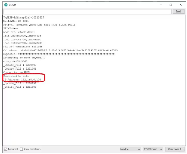 至于安装代码,过程是标准的,唯一的要求是安装GxEPD2库,它是提供的。一旦代码安装完成,我们需要打开串行监视器并重置设备,这将在串行监视器上为我们提供其本地IP地址。我们以后会用到这个地址。
