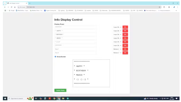 需要显示的文本分为8个字段。在每一行中,我们可以选择提供的三种字体大小中的一种,旁边是一个用于删除该行内容的按钮。下面是一个字段,我们可以直观地看到写在黑板上的文字将是什么样子。底部是一个绿色的更新按钮,通过它我们可以通过Wi-Fi网络将内容传输到电路板上。在屏幕顶部的两个按钮上,我们可以选择黑色背景上的白色文本,或者白色背景上的黑色文本。