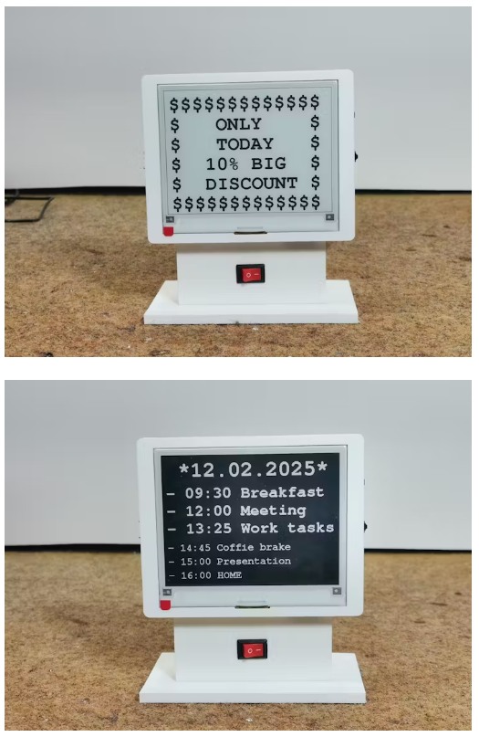 最后是一个简短的结论。电子纸显示器可以在照明或自然光下清晰显示图像/文本,无需背光,功耗更低,部分刷新寿命更长。能见度几乎是180度。本项目中展示的设备使用了一个内置ESP32S微控制器的电子纸显示模块和一个封闭在合适外壳内的附加组件,几乎不需要硬件干预,所以我们只需要安装草图,就可以得到一个功能齐全的最终产品。