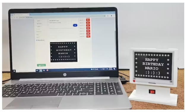 让我们看看这个设备在真实环境下是如何工作的。开启后,屏幕上出现带有设备名称的文本,然后以白板样式出现空白屏幕。此时,电路板已连接到Wi-Fi网络,并准备在其上打印文本。正如我前面提到的,我们通过web界面输入文本,我们通过在任何web浏览器中从串行监视器输入给定的IP地址来访问该界面。我们将收到的地址输入到浏览器中,屏幕上就会出现一个清晰的界面,通过这个界面,我们可以在显示器上输入文本。