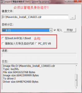 以管理员身份运行硬盘助手,去掉除写入之外的其他checkbox的选中,先选择Mac镜像文件,后选择分区L,这个顺序不能错,否则关闭硬盘助手,重新打开,截图如下: