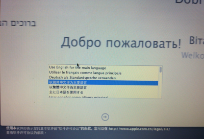 重启,变色龙引导进入,选择Mac OS Install盘(这个其实就是Windows8下的L盘),几分钟后,会进入语言选择界面,如下: