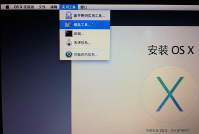 选择语言,点击箭头继续,之后出现”安装Mac OS X“的界面,点继续,再出现的协议中,点同意,进入目标盘选择阶段,这个时候,要选择屏幕上方的”使用工具“,选择”磁盘工具“,截图如下: