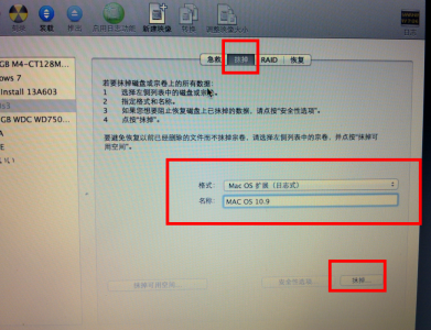 注意选择要安装Mac的目标盘(应该是Windows8下的那个未格式化得M盘),但是这个功能中是以数字命名的,可能是disk03,通过磁盘大小可以进一步确认是否选对了磁盘,抹盘的时候会把数据,如果选错了磁盘的话。。。