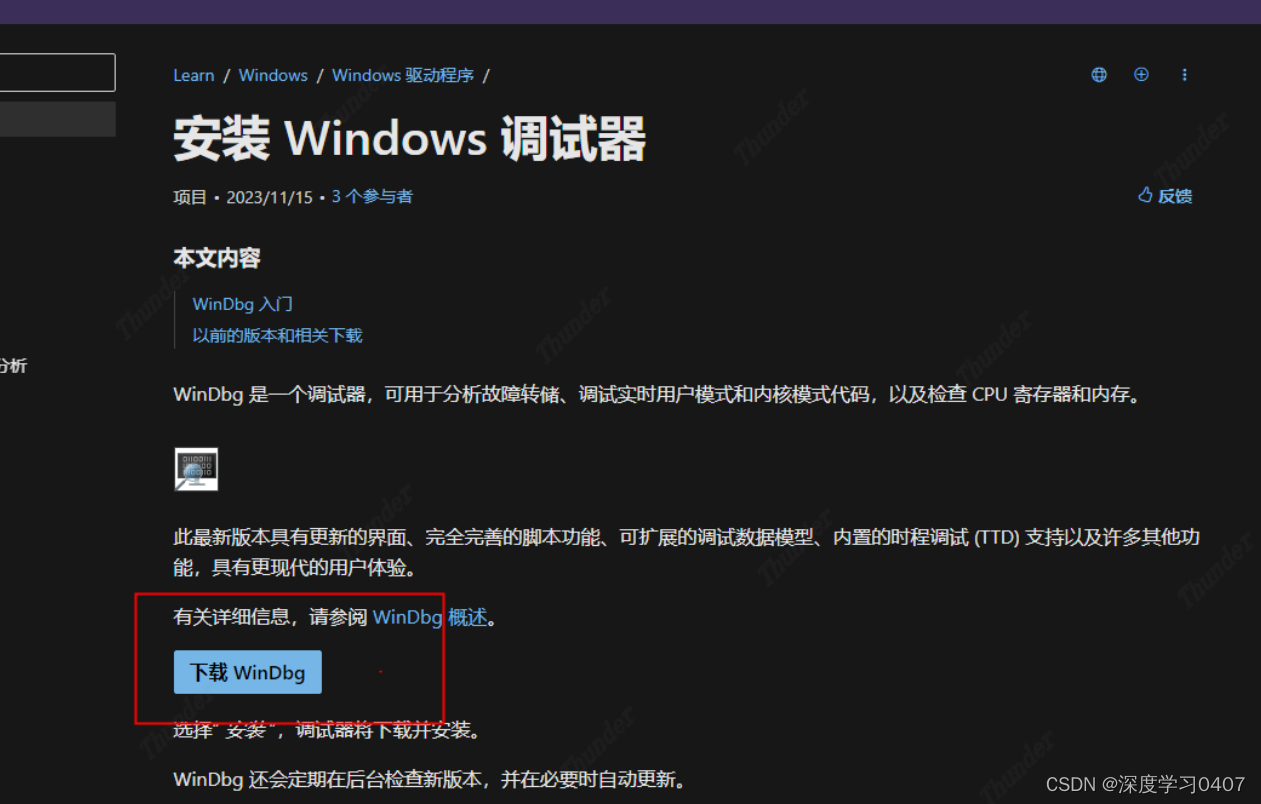 windows操作系统蓝屏错误日志分析-通用方法 一、操作系统频繁蓝屏的内存DUMP文件的路径二、安装WinDbg的日志分析软件 一、操作系统频繁蓝屏的内存DUMP文件的路径 此电脑-右键-属性-高级系统设置 二、安装WinDbg的日志分析软件 微软的官方安装地址: https://learn.microsoft.com/zh-cn/windows-hardware/drivers/debugger/ 单击分析按钮 然后AI一下,查下用途,定位故障原因