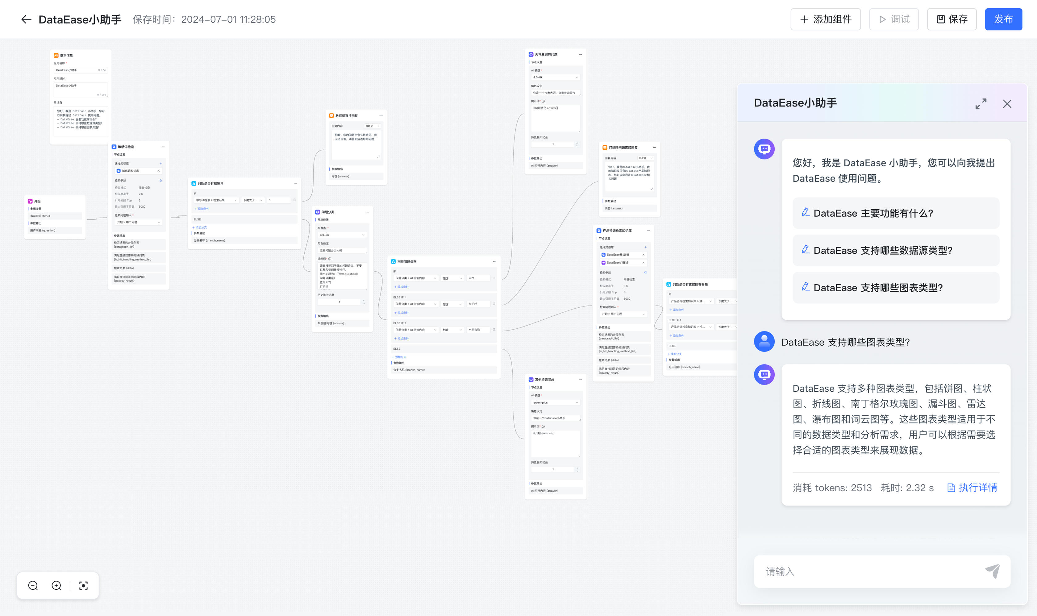 为解决自动化和批处理情景中复杂业务逻辑,工作流提供了丰富的逻辑节点,如代码节点、IF/ELSE 节点、模板转换、迭代节点等,除此之外也将提供定时和事件触发的能力,方便构建自动化流程。