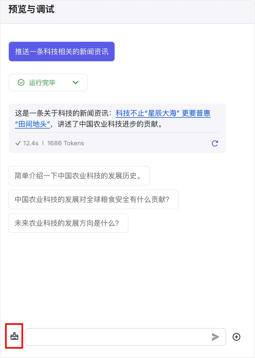 配置好这个AI Agent后,就可以在预览与调试区域中测试这个AI Agent 是否符合预期,测试后可单击清除图标清除对话记录。